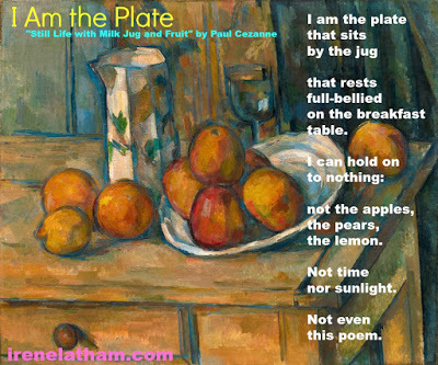 For today's poem, I am focusing on the "eat" part of my theme... sort of! The piece I've selected is "Still Life with Milk Jug and Fruit" by Paul Cezanne. My regular readers know I adore persona poems, so this newest should come as no surprise. Although it DID come as sort of a surprise to me... I started out trying to bring movement to this still life, but I just wasn't finding anything fresh... and I kept looking for some strange angle, some unusual way into the poem... voila! The plate! (It might actually be a bowl, but it's so shallow... and so unremarkable it didn't even make it into Cezanne's title of the piece, which gives me the freedom to call it a plate if I want to. :)