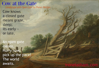 Today's piece Landscape with Open Gate by Pieter Moijin is certainly rural, and I am certain there is a garden/farm just out of the frame. And cows. There are definitely cows! When writing poems inspired by art, it often helps me to look beyond the frame... this is a way to bring something unexpected to the poem, to enrich the experience of the painting. Another question to ask: who (or what) is seeing this image? Right away, that gave me the eyes of a cow.