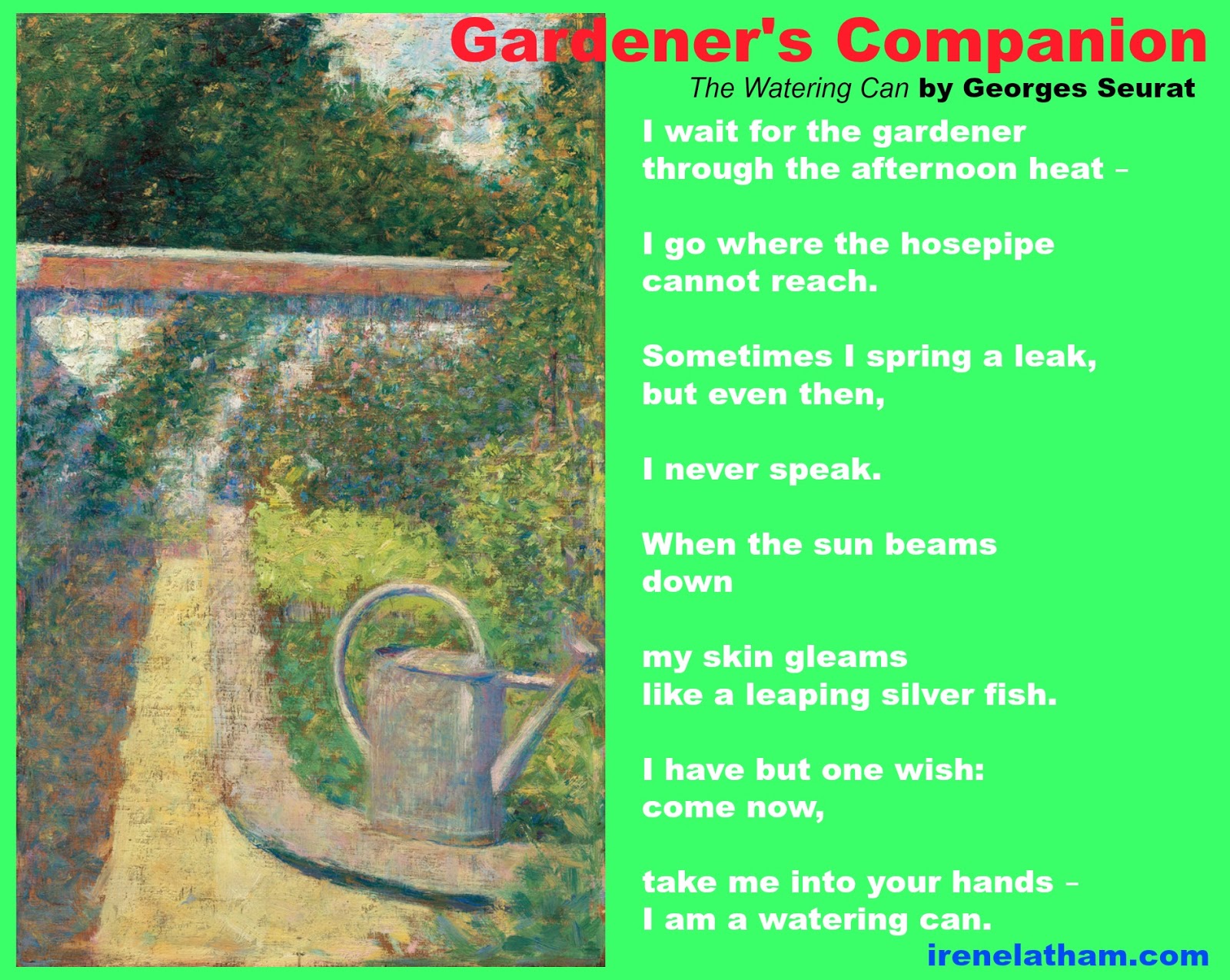 "Gardener's Companion" after The Watering Can by Georges Seurat"Man, Reading" after Denoisel Reading in the Garden by James Tissot"At the Vegetable Market" after Vegetable Market at Pontoise by Camille Pissarro"Triolet for Planting Day" after The Artist's Garden at Eragny by Camille Pissarro