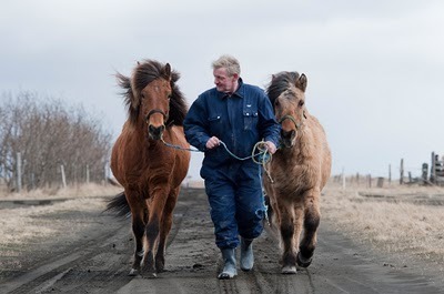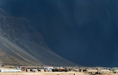 In the interests of posting a picture with easily visible horses, here is an Icelandic farmer with a pair of animals he lost in the ash. You get an idea of the size of the animals. They don't exactly loom over you.