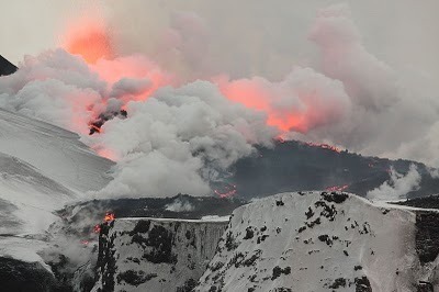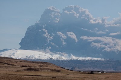 Photos by Boaworm, licensed under Creative Commons. The top two are the original eruption, the photogenic lava fountain. The bottom photo is the ash plume from the second explosion under the ice. This is what closed down Europe.