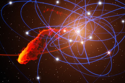 The monster at the center of our Galaxy is about to get fed. Recent observations by the Very Large Telescopes indicate that a cloud of gas will venture too close to the supermassive black hole at the Galactic center. The gas cloud is being disrupted, stretched out, heated up, and some of it is expected to fall into the black hole over the next two years. In this artist's illustration, what remains of the blob after a close pass to the black hole is shown in red and yellow, arching out from the gravitational death trap to its right. The cloud's orbit is shown in red, while the orbits of central stars are shown in blue. The infalling nebula is estimated to contain several times the mass of our Earth, while the central black hole, thought to correspond to the radio source Sagittariaus A*, contains about four million times the mass of our Sun. Once it falls in, nothing is expected to be heard from the doomed gas ever again.