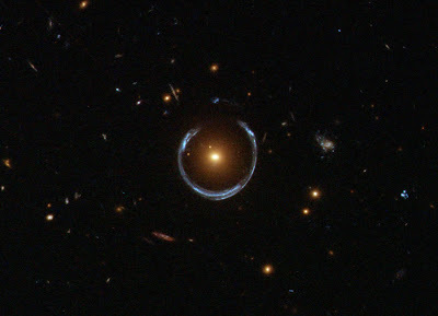 What's large and blue and can wrap itself around an entire galaxy? A gravitational lens mirage. Pictured above, the gravity of a luminous red galaxy (LRG) has gravitationally distorted the light from a much more distant blue galaxy. More typically, such light bending results in two discernible images of the distant galaxy, but here the lens alignment is so precise that the background galaxy is distorted into a horseshoe -- a nearly complete ring. Since such a lensing effect was generally predicted in some detail by Albert Einstein over 70 years ago, rings like this are now known as Einstein Rings. Although LRG 3-757 was discovered in 2007 in data from the Sloan Digital Sky Survey (SDSS), the image shown above is a follow-up observation taken with the Hubble Space Telescope's Wide Field Camera 3. Strong gravitational lenses like LRG 3-757 are more than oddities -- their multiple properties allow astronomers to determine the mass and dark matter content of the foreground galaxy lenses.