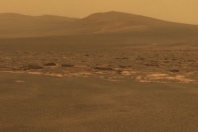What can the present-day terrain in and around large Endeavour crater tell us about ancient Mars? Starting three years ago, NASA sent a coffee-table sized robot named Opportunity on a mission rolling across the red planet's Meridiani Planum to find out. Last week, it finally arrived. Expansive Endeavour crater stretches 22 kilometers from rim to rim, making it the largest crater ever visited by a Mars Exploration Rover (MER). It is hypothesized that the impact that created the crater exposed ancient rock that possibly formed under wet conditions, and if so, this rock may yield unique clues to the watery past of Mars. Pictured above, the west rim of Endeavour looms just ahead of the Opportunity rover. Opportunity may well spend the rest of its operational life exploring Endeavour, taking pictures, spinning its wheels, and boring into intriguing rocks.