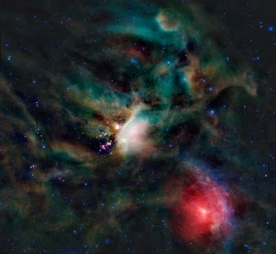 Dust clouds and embedded newborn stars glow at infrared wavelengths in this tantalizing false-color composition from WISE, the Wide-field Infrared Survey Explorer. The cosmic canvas features one of the closest star forming regions, part of the Rho Ophiuchi cloud complex some 400 light-years distant near the southern edge of the pronounceable constellation Ophiuchus. After forming along a large cloud of cold molecular hydrogen gas, young stars heat the surrounding dust to produce the infrared glow. Stars in the process of formation, called young stellar objects or YSOs, are embedded in the compact pinkish nebulae seen here, but are otherwise hidden from the prying eyes of optical telescopes. An exploration of the region in penetrating infrared light has detected emerging and newly formed stars whose average age is estimated to be a mere 300,000 years. That's extremely young compared to the Sun's age of 5 billion years. The prominent reddish nebula at the lower right surrounding the star Sigma Scorpii is a reflection nebula produced by dust scattering starlight. This view from WISE spans almost 2 degrees and covers about 14 light-years at the estimated distance of the Rho Ophiuchi cloud.
