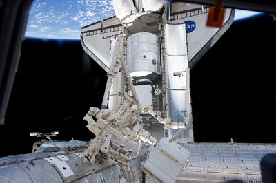 What's happening outside the space station? A space shuttle has docked. Five days ago, the space shuttle Discovery was launched to the International Space Station, carrying six crew members and the large Leonardo Multi Purpose Logistics Module. Three days ago, as pictured above, the docked shuttle was prepared to be unloaded by the space stations Dextre robot and Canadarm2. The above expansive photo captures much more, however, including Japan's Kibo Experiment Module on the lower right, Earth across the top of the frame, and a seemingly starless backdrop of space in the distance. During the next week, the shuttle and ISS crews are scheduled to permanently attach Leonardo as well as fix and upgrade parts of the ISS. After 38 previous voyages, this is expected to be the last space mission for the Space Shuttle Discovery.