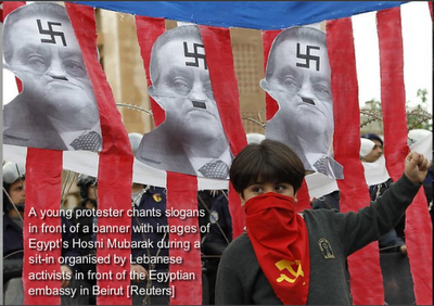 Another great image from the Middle East. This one is Reuters, via Al Jazeera. I'm fascinated by the iconography of demonstrations. Here the symbols are traditional: the Hitler moustache and swastika on Mubarak, the child's hammer and sickle face mask. If you look two pictures down, you will find someone using V for Vendetta (the comic or the movie) and the Domino Theory, which comes (as far as I know) from the US and the Vietnam Era. In between is the guy with a sign in English saying Egypt equals freedom. What we have here is an international language and iconography. Demonstrators are signaling to the world.