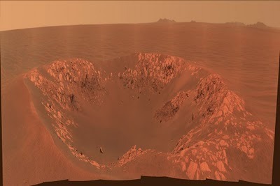 The robotic rover Opportunity has chanced across another small crater on Mars. Pictured above is Intrepid Crater, a 20-meter across impact basin slightly larger than Nereus Crater that Opportunity chanced across last year. The above image is in approximately true color but horizontally compressed to accommodate a wide angle panorama. Intrepid Crater was named after the lunar module Intrepid that carried Apollo 12 astronauts to Earth's Moon 41 years ago last month. Beyond Intrepid Crater and past long patches of rusty Martian desert lie peaks from the rim of large Endeavour Crater, visible on the horizon. If Opportunity can avoid ridged rocks and soft sand, it may reach Endeavour sometime next year.