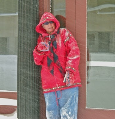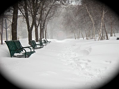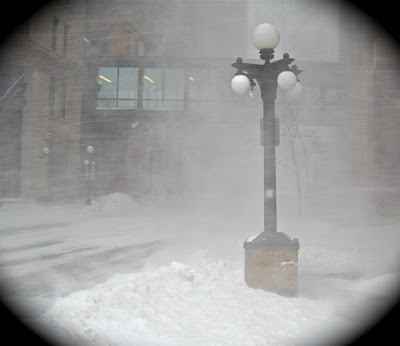 We're in the middle of a serious snow storm. Ten to twenty inches was predicted. Right now, the snow is falling so thickly we can see across the street, but not much farther. Patrick is taking photos of nearby buildings. They are almost colorless shadows, looming through whiteness.