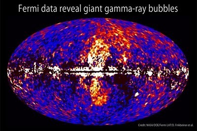 Did you know that our Milky Way Galaxy has huge bubbles emitting gamma rays from the direction of the galactic center? Neither did anybody. As the data from the Earth-orbiting Fermi satellite began acuminating over the past two years, however, a large and unusual feature toward our Galaxy's center became increasingly evident. The two bubbles are visible together as the red and white spotted oval surrounding the center of the above all sky image, released yesterday. The plane of our Galaxy runs horizontally across the image center. Assuming the bubbles emanate from our Galaxy's center, the scale of the bubbles is huge, rivaling the entire Galaxy in size, and spanning about 50,000 light years from top to bottom. Earlier indications of the bubbles has been found on existing all sky maps in the radio, microwave, and X-ray. The cause of the bubbles is presently unknown, but will likely be researched for years to come.