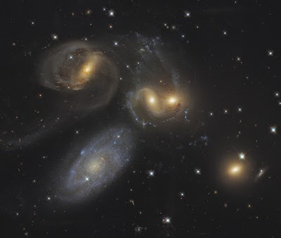 The first identified compact galaxy group, Stephan's Quintet is featured in this eye-catching image constructed with data drawn from the extensive Hubble Legacy Archive. About 300 million light-years away, only four galaxies of the group are actually locked in a cosmic dance of repeated close encounters. The odd man out is easy to spot, though. The four interacting galaxies (NGC 7319, 7318A, 7318B, and 7317) have an overall yellowish cast and tend to have distorted loops and tails, grown under the influence of disruptive gravitational tides. But the larger bluish galaxy, NGC 7320, is much closer than the others. Just 40 million light-years distant, it isn't part of the interacting group. In fact, individual stars in the foreground galaxy can be seen in the sharp Hubble view, hinting that it is much closer than the others. Stephan's Quintet lies within the boundaries of the high flying constellation Pegasus.