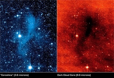 Stars and their planets are born in cold, dark, interstellar clouds of gas and dust. While exploring the clouds at infrared wavelengths, astronomers have made a surprising discovery -- dozens of cases where dense cloud cores shine by reflecting infrared starlight. Based on archival Spitzer Space Telescope data, these panels illustrate the newly described phenomenon, known as coreshine. At longer infrared wavelengths (right) the core of cloud Lynds 183 is dark, but at shorter infrared wavelengths (left) the core clearly shines, scattering light from nearby stars. As seen in these panels, the elongated core covers a mere 1.5 light-years. The scattering requires dust grains that are about 10 times larger than previously thought to exist in the clouds, about 1 micron in size instead of 0.1 micron. For comparison, a human hair is about 100 microns thick. The larger dust grains indicated by coreshine could change models of the early phases of star and planet formation, a still mysterious process hidden within the interstellar clouds. Dark nebula Lynds 183 lies around 325 light-years away in the constellation Serpens.