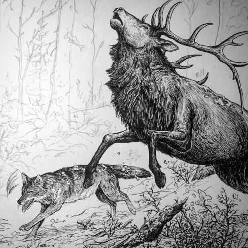 Some more progress into this winter scene #illustration #commission #winterscene #coyote #elk #brushandink #traditionalart