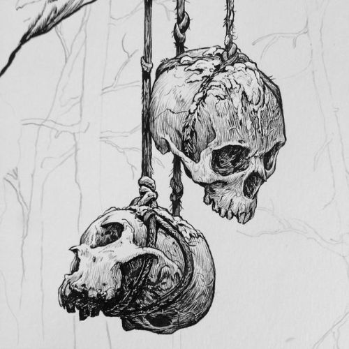 Just a couple of friendly skulls hanging from a branch #illustration #inking #humanskull #skullillustration #brushandink