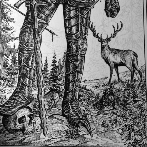 A little more of this “Dragon Knight” piece. #penandink #skull #deer #forestdrawing #medievalknight