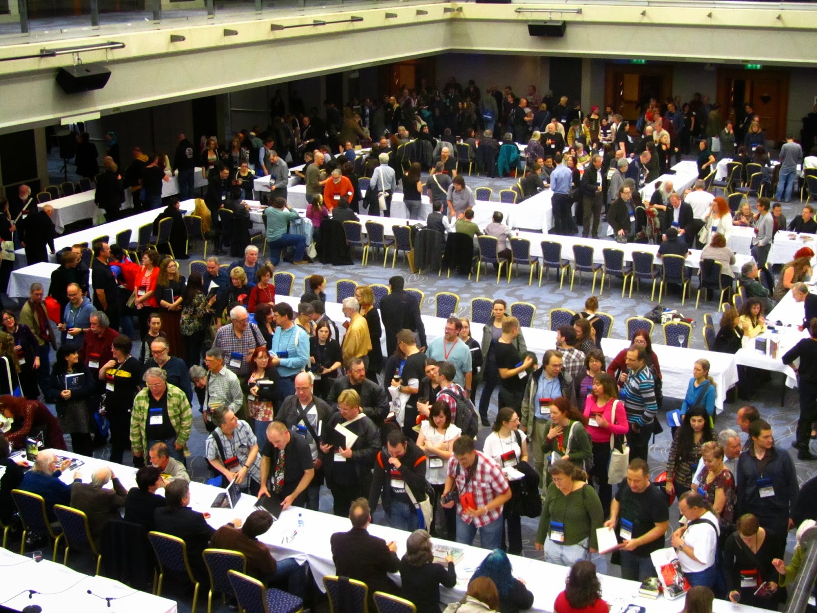 As soon as you register at the front desk they give you LOTS of free books - there are literally stacks of books laid out by publishers for the taking thereof. Some of them haven't even been published yet and are Sekret Preview copies! So you fill up your bags (they also give you bags). And then you go to the Dealers' Room and buy more books from small presses and second-hand sellers - and they often give you free chocolates and mugs and postcards and stuff when you make a purchase. So by the end of the weekend you can have suitcases full of freebies ... which is the point at which you realise that you haven't got a car and you have to make it back on the train/tube/plane hauling the lot. A process of winnowing takes place. Free books are left in hotels all over the city, possibly distorting the economy for years to come.