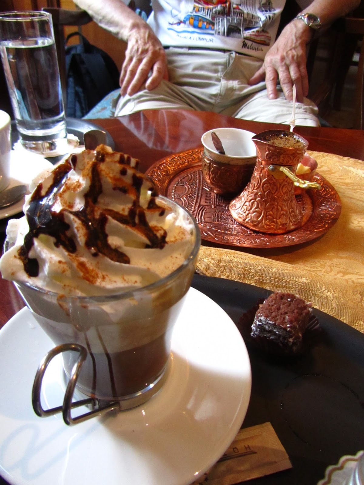 A cultural contrast in coffees, at the Viennese CafeWe arrived on the first night of the Islamic festival of Ramadan. We went up the hill to see the mosque lights go on when they fired the mortar signalling sunset. Several local people handed us turkish delight and special Ramadan bread - it was really touching.
