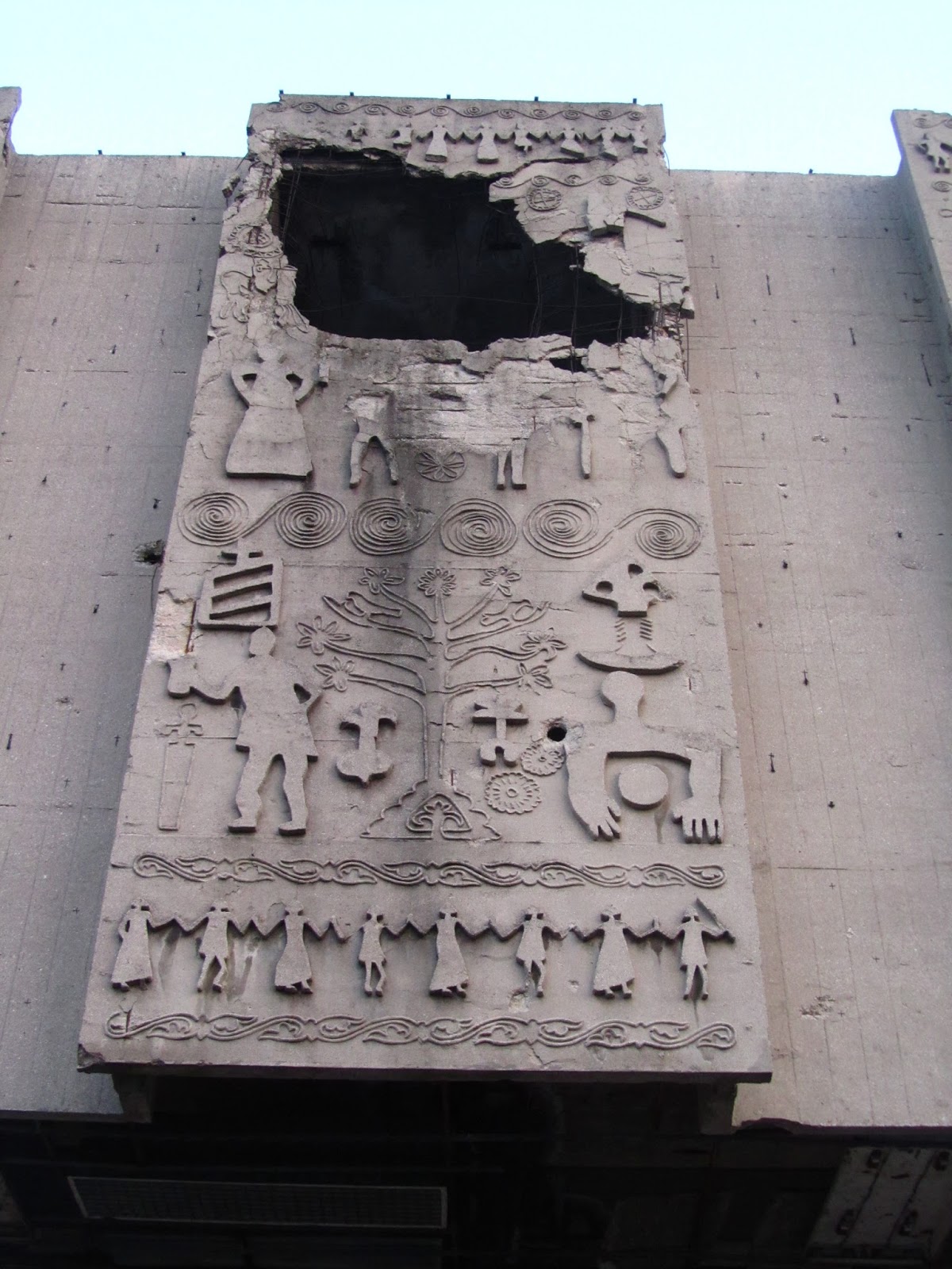 Derelict concrete building destroyed by war: ancient symbols, shell-hole from the 1990s.