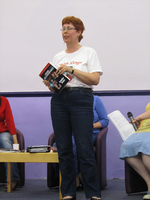 Jennifer Denys taking the michael out of erotic romance tropes :-)There was fudge, enormous quantities of coffee, a book stall, a tombola (I won a pen: Jennifer won lube, grrr) and a purple lecture hall wherein there were MANY READINGS by erotica-friends new and old: