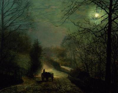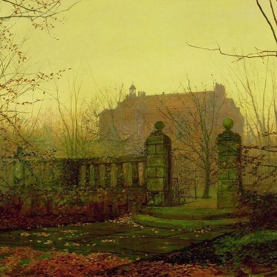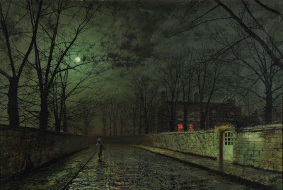 All pictures by John Atkinson Grimshaw (1836-1893)It's All Hallows' Eve, the nights are drawing in ... so let me tell you a ghost story. Two friends are sitting up in a deserted house, waiting for the ghost to appear...I had to hand it to him: Morgan was never lacking in confidence. As for myself, my curiosity was piqued, certainly, and with it my sense of adventure. And if I have rather more imagination than my friend, I was determined not to let it get the better of me. I rose, throwing the stub of my cigar into the fire, and started to stroll about the room, stretching my legs. We’d uncovered only the two chairs we’d dragged to the hearth; now I twitched the dust sheet off a couple more pieces of furniture, discovering a high-backed oak settle and a coffer that turned out to be empty.