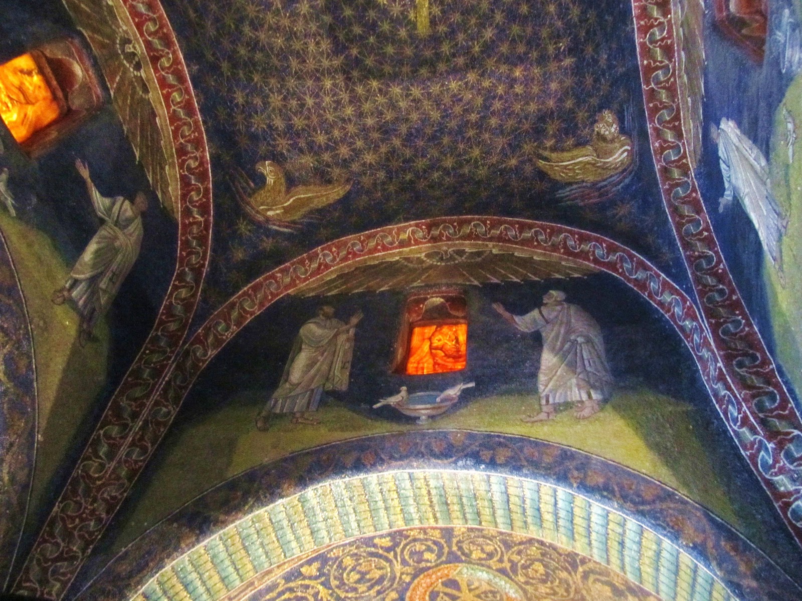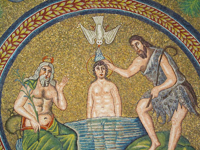 The Mausoleum of Galla PlacidiaThis below is one of my favourites - and no, not just because of the cheery depiction of Jesus' tackle through the clear water! It's notable in these early artworks that Jesus is shown as young man, and beardless, instead of the iconic face we're used to nowadays. Love how the dove is spitting showering him with water from its beak. And that bearded, horned man on the left there ... he's the personification of the River Jordan, in old pagan style.