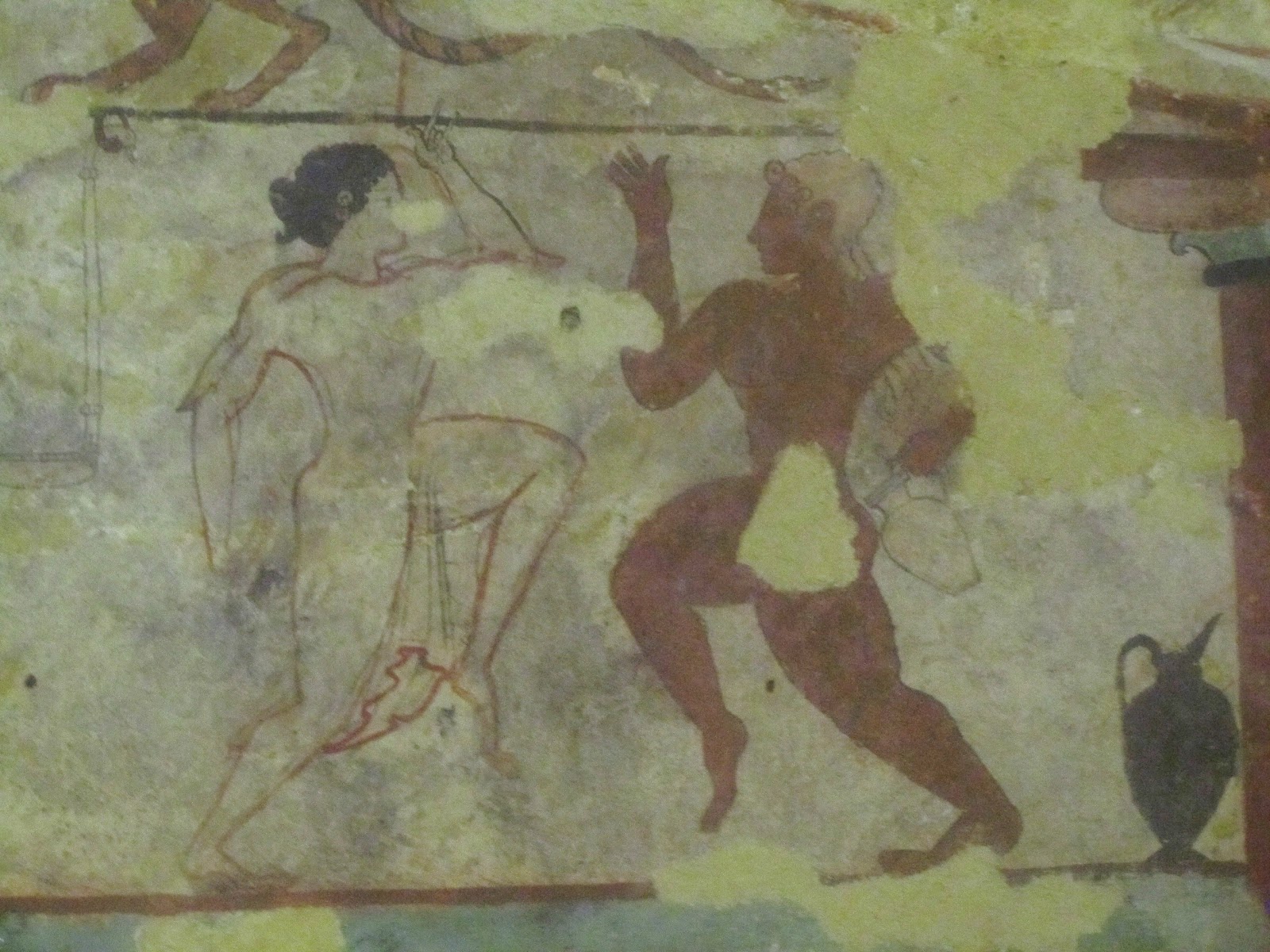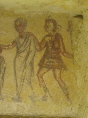 One of the things we did on my recent flit around Europe, was pay our respect to the Etruscans. The first major civilization on the Italian penninsula, they were rivals of - and eventually eclipsed, conquered and assimilated by - Rome. They left a lot of tombs behind, though. The ones at Tarquinia are particularly famous for their, um, lively depictions of ancient practices. Heh. They were decadent, wealthy, fabulously artistic (especially when it came to gold-working) and lived for pleasure, it is said. They dominated the area that is now Tuscany - which is where it got its name.The thing that really drove the Romans and Greeks nuts was the behaviour of Etruscan women, who partipated freely and enthusiastically in public life alongside their menfolk, and seem from the archaeological evidence to have enjoyed high status and regard. An apoplectic Greek historian reported that "these take great care of their bodies and exercise naked, often along with men ... They sit down to table not beside their own husbands but beside any of the guests, and they even drink to the health of anyone they please! Moreover they are great winebibbers and very beautiful to behold. The Tyrrhenians bring up together all those children that are born to them, heedless of who their father may be ... There is no shame for a Tyrrhenian to be seen committing a sexual act in public." They also practiced enthusiastic bisexuality and manscaping of body-hair :-)