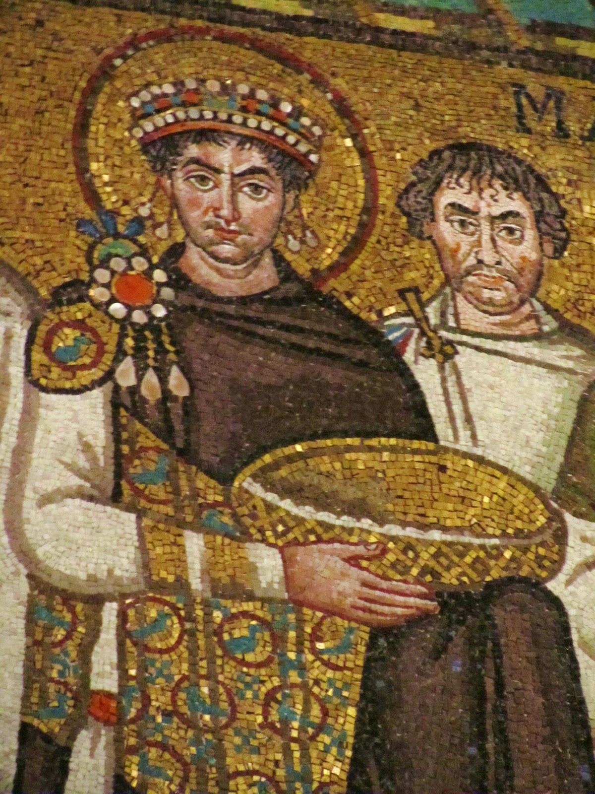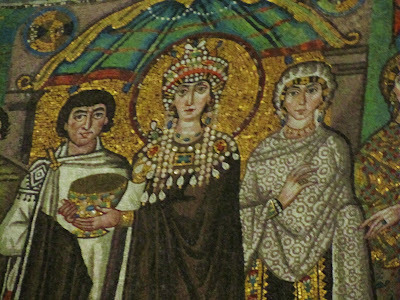 , is, incidentally, an Arian.)But back to the mosaics ... and it's in the Basilica of San Vitale that we find two of the most interesting portraits in mosaic form. This ill-shaven, slightly sleazy-looking fellow is the Emperor Justinian I.