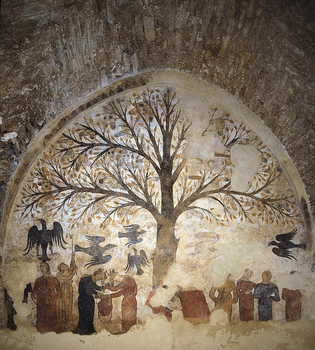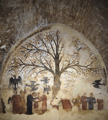 [click to enlarge]Today is the day I'm giving my annual walk/talk on Tree Folklore and Story, so I thought I'd post this picture of a 13th Century tree fresco found in Massa Marittima, Tuscany. Hidden behind a layer of whitewash on the public fountain for centuries, it was rediscovered in 1999-2000 and restored 2008-11 (to some controversy - read all about that here).