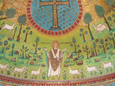 From the Basilica of Sant'Apollinare in ClasseI spent a day in Ravenna last month and I really have to share with you some of my pictures of the mosaics that make that Italian town famous! All over the city, in churches and sepulchres, are found the most incredible, detailed, glittering Byzantine mosaics. They're made of glass and gold, and these pictures cannot do justice to the colour saturation or the sheer bling of their visual effect.