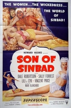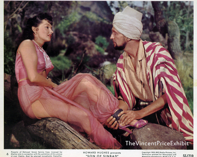 Dale Robertson in 1955 movie Son of Sinbad (also called Sinbad, ahem). Hot Hero Rating: Um ...okay. Monster rating: none, still, and much of the content of this movie can be surmised by this shot of sidekick hero Vincent Price trying to free this young lady from her pointy-breasted harem outfit and even more unlikely shoes.