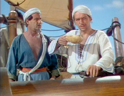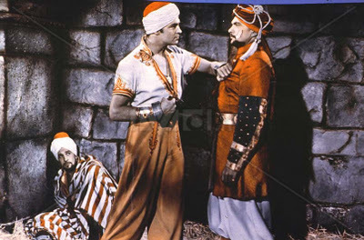 This picture shows Douglas Fairbanks Junior from the 1947 Sinbad the Sailor, in seriously dodgy technicolor. Hot Hero Rating: Ugh. Why did heroes in those days look so old? (He was 38 when this was made. He just looks like a bank manager in his fifties.) Monster rating: there aren't any in the movie.