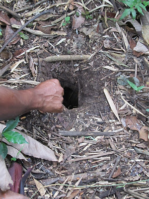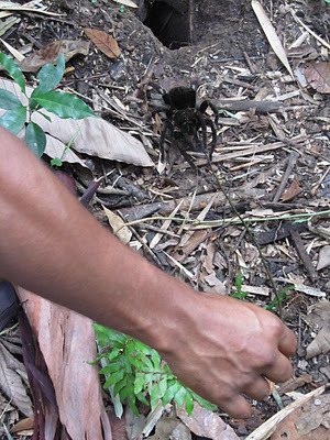 It's a Chicken Tarantula ... so called because they kill chickens. It lives in rodent holes in the Amazon forest. The rain forest has an appalling number of arthropods, many of which take it in turns to be VERY LOUD right round the clock. We saw lots of Army Ants - the trick is never to stand still without checking the ground at your feet - but the really scary one is the Bullet Ant, which is a fast lone ant less than an inch long. It has that name because being bitten by one hurts like being shot. We were scared of those...