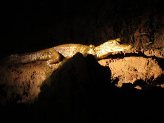 This is a Spectacled Cayman. They live in rivers and aren't dangerous.