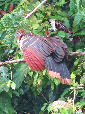 This the Stinky Bird - the Hoatzin. It's about the size of a chicken and is just amazing. Its chicks are born with claws on their wing-joints, like dinosaurs. If threatened they jump into the river, swim away underwater and use their claws to climb back up low-hanging branches.