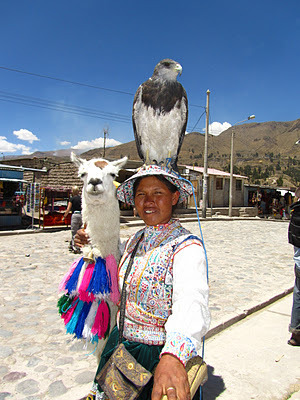 Llamas (which are tall with roman noses) are used for meat (tough), carrying stuff and luring tourists. I think it's a Black-Chested Buzzard Eagle she has on her head.