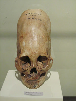 This skull is an example of cranial deformation caused by binding the head from a very young age. (Pictures like this are occasionally hocked around the internet as "alien skulls" but that's rubbish). It was done to mark ethnic identity and social caste. Rather surprisingly, there's no evidence it caused brain damage. Nowadays, tribes that used to bind skulls just use distinctive hats.