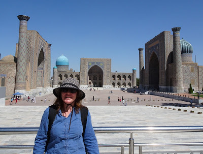 I am just about recovering from the jetlag of my holiday on on Silk Road! Here's a pic of me sweltering in the Registan Square in Samarkand, which gives you an instant flavour of what Uzbekistan feels like for the tourist - it's all about Islamic era historical monuments; it's big, bright, clean and orderly.