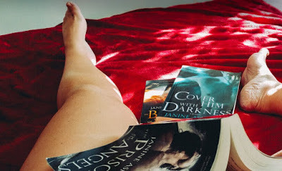 The uncropped version of this photo is definitely NSFW - and you can find it over at Molly's Daily Kiss where she recounts her experience reading my novel The Prison of the Angels , one afternoon when she should have been making the beds.