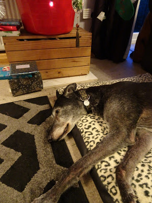 Background: our elderly greyhound Caspian has been sleeping peacefully under the Xmas tree all holiday.