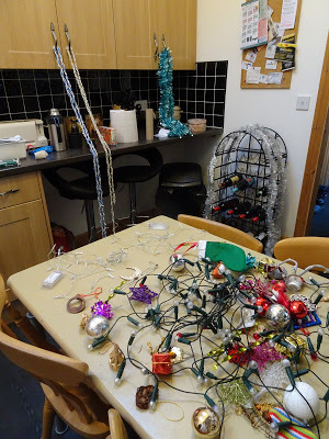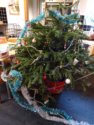I failed. The tree went flying. A bucketful of water hit the carpet. Mr Ashbless leapt up from his bed of pain and grabbed the tree. The bloody dog just lay there as I flailed around trying to swab up the water with towels. Eventually we forced him to his feet and out of the way.