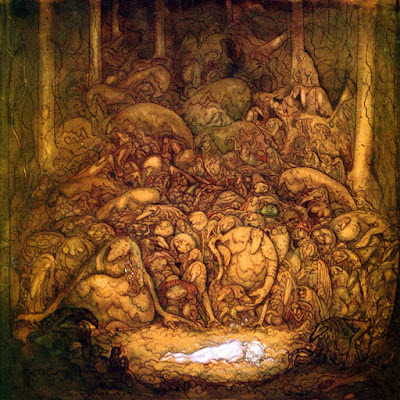 He was the absolute master of visualizing trolls, and he liked best to contrast their huge, lumpen, ugly forms with tiny delicate humans - often children or princesses - in a spectacular show of vulnerability and barely-concealed menace.