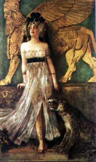 Semiramis by Cesare Saccaggi (1868-1934)As an adult she married a nobleman called Omnes, but conducted herself during a seige so impressively that the Assyrian King Ninus demanded her for himself. Omnes commited suicide, and Semiramis entered the royal harem - somewhat resentfully, the evidence suggests. When she bore a son, Ninias, Ninus offered her any boon and she said "Make me the ruler of the empire for one day." He foolishly agreed - whereupon she ordered the guards to kill him, and seized power in the name of her son.