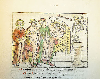 Semiramis depicted in De Claris Mulieribus (15th Century)However, Semiramis the mythical/artistic figure is larger than life in every way! There are many (conflicting) legends about her; she was the daughter of the water-goddess Atargatis, was abandoned at birth and fed by doves until adopted by a shepherd (in standard heroic style).