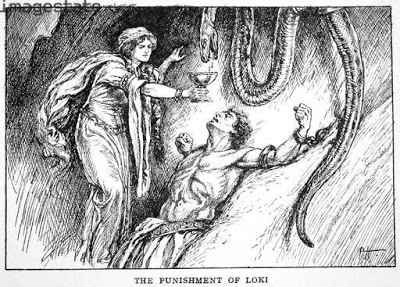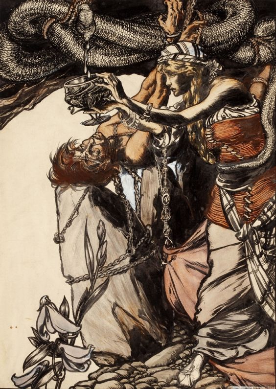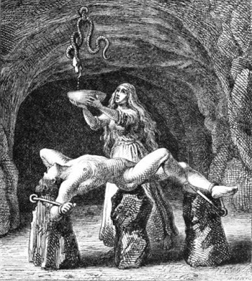 W. G. Collingwood: Loki Bound (1908)To punish him even further one of his sons is killed to furnish the ropes that bind him.Then the goddess Skadi hangs a snake over his head to drip agonising poison in his eyes. Because gods are sadistic like that.