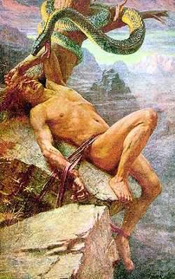 Niels Jacobsen (1861-1941): Loki Chained to the Rocks Eventually Loki himself goes too far - he causes the death of the beautiful god Baldur and then gets mean-drunk and talks smack to all the rest. They decide to chain him up forever beneath the earth.