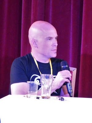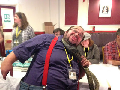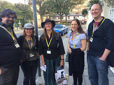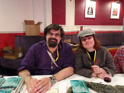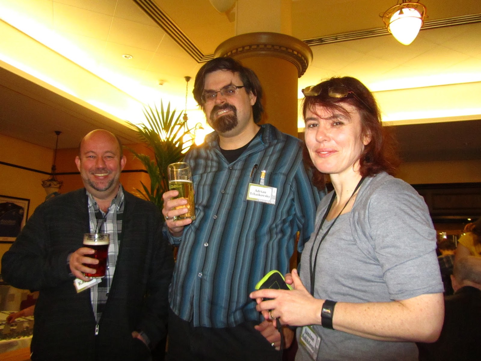 Janine was there under her SUPER SECRET NAME because she was launching her new collection of horror stories. Here she is with other minor contributor Adrian Tchaikovsky, and me (obviously I'm the most important one):