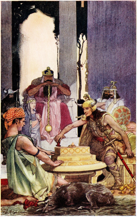 Lugh's Enclosure (1912) by Ernest WallcousinsThe Lughnasadh festival was a specifically founded as funeral games for Lugh's foster-mother, Taillte, an agricultural goddess who cleared the whole Ireland for farming - and then died of exhaustion. (Remember, Imbolc features imagery of a pure young girl, Beltane a horny young maiden: Lughnasadh is founded on a sacrificial mother-goddess, even if she doesn't get the name credit).Festivals took place on hilltops and included feasting, matchmaking, athletic contests, an offering of the first fruits of the year (bilberries and blackberries and apples), and a bull sacrifice. All these customs were kept on by the Christian Church, including making pilgrimage up hills and mountains. Though nowadays the name is mostly remembered for a very depressing movie, Dancing at Lughnasa: