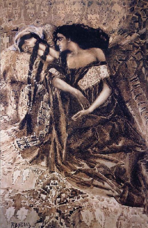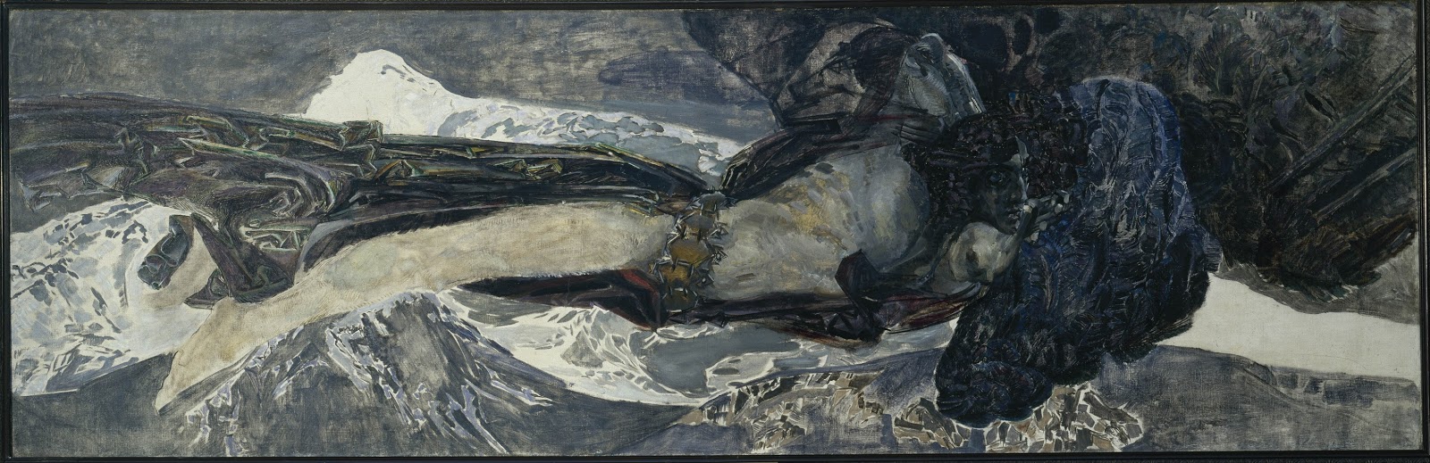 Vrubel became interested in illustrating a long poem by Lermontov, Tamara and the Demon (full English translation here). In that work a fallen angel, tooling about feeling bored with doing evil stuff, falls in love with Georgian princess Tamara when he espies her dancing at her wedding.