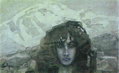 Head of a DemonVrubel became interested in illustrating a long poem by Lermontov, Tamara and the Demon (full English translation here). In that work a fallen angel, tooling about feeling bored with doing evil stuff, falls in love with Georgian princess Tamara when he espies her dancing at her wedding.