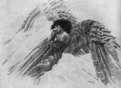 Demon Seated (1890)Whilst poking around on t'internet for inspiration for Cover Him with Darkness , I came across the art of Mikhail Vrubel (1856-1910). He was a Russian member of the Art Nouveau and Symbolist movements, and though he started off with a lot of religious art, it was eventually a fallen angel that destroyed him ...